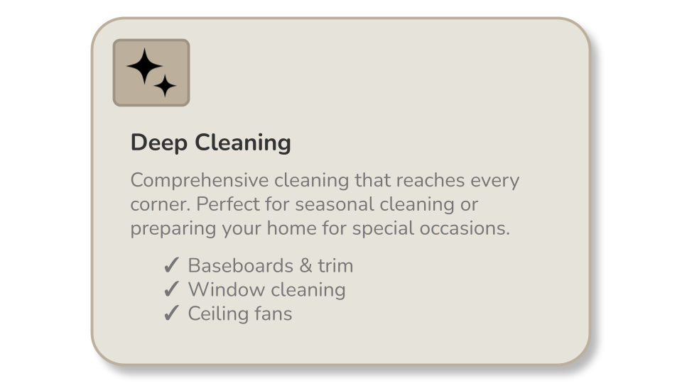 From sparkling kitchens and bathrooms to spotless windows, baseboards, fans, and appliances, we make every space feel fresh and welcoming.